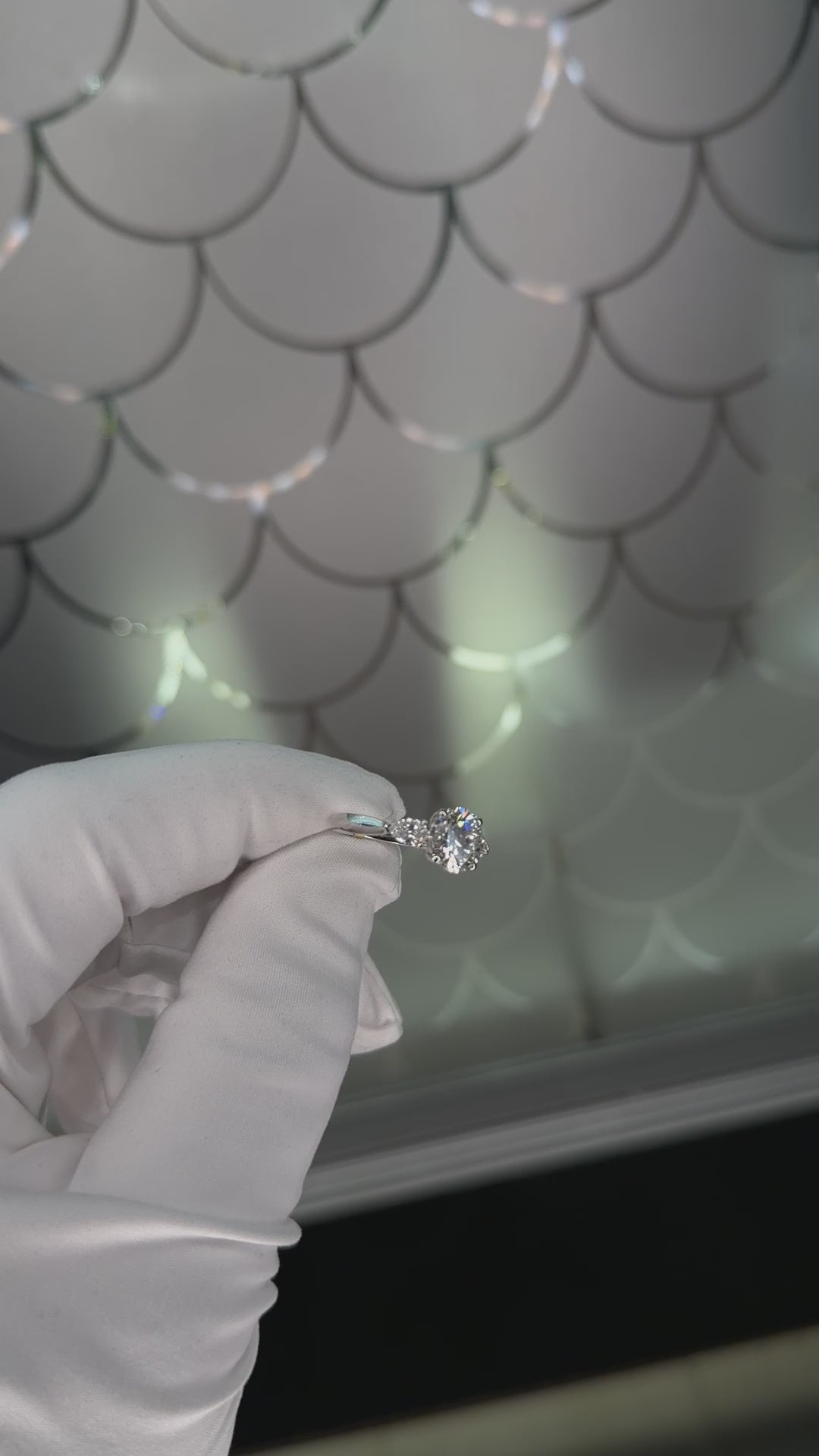 All side stones are carefully matched in E+ color with VVS2+ clarity, ensuring exceptional purity and visual consistency. Set in sleek 18K white gold, the ring’s clean lines enhance the brilliance of the diamonds while maintaining a modern, luxurious profile.