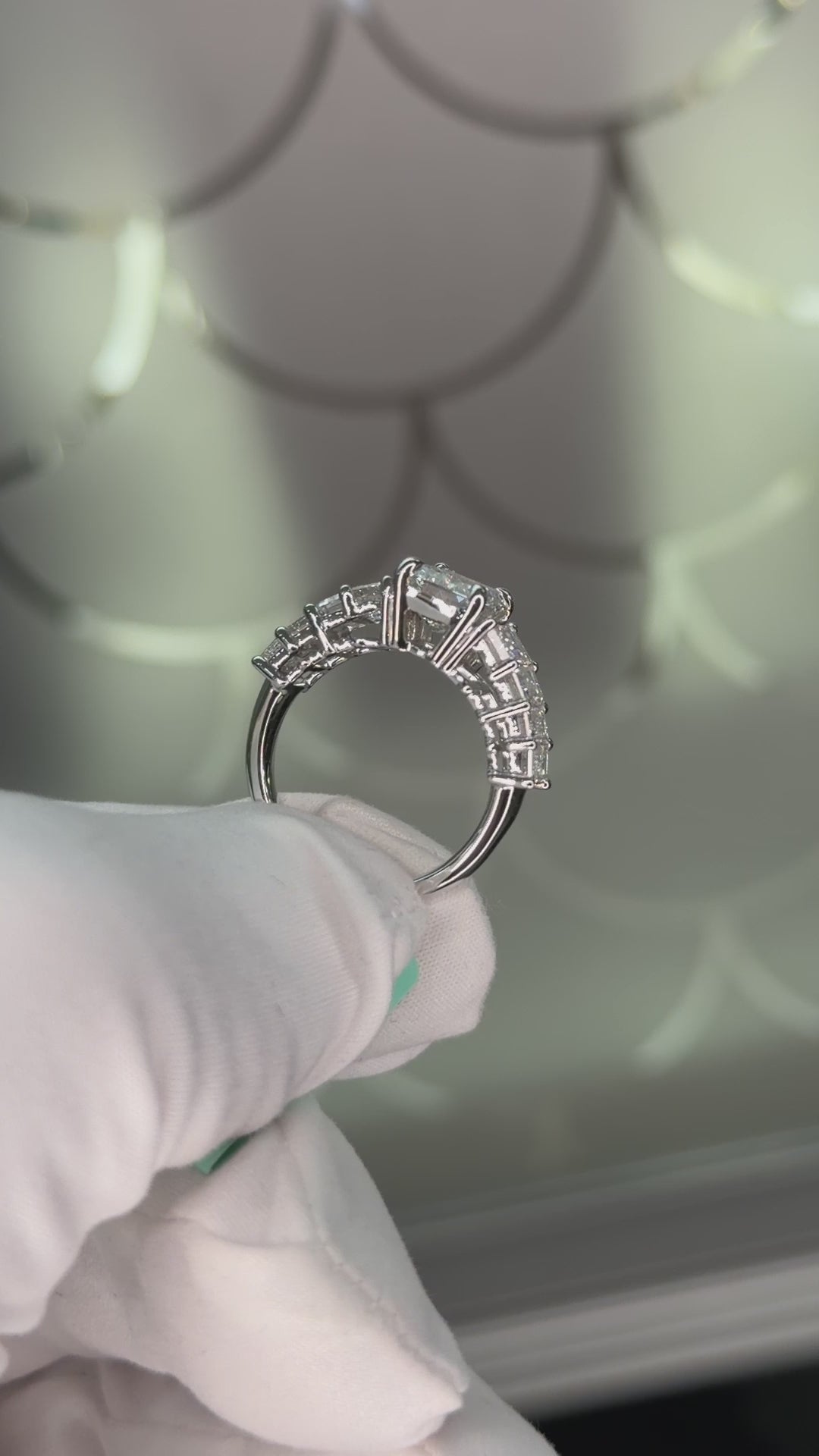 With a total diamond weight of 5.29 ct, the structured geometry of the emerald cuts is beautifully complemented by the cool tone of 18K white gold, enhancing the ring’s sharp lines and contemporary elegance.