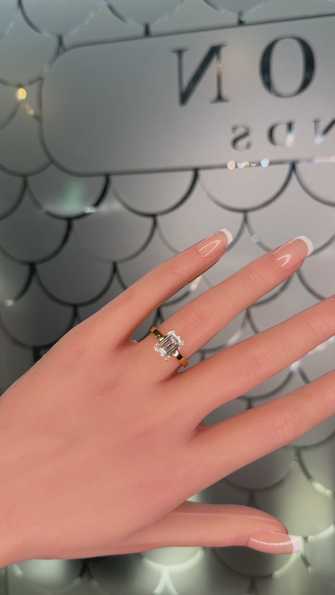 This solitaire engagement ring is crafted in solid 18K yellow gold and set with a 2.51 ct emerald-cut lab-grown diamond in D color and VVS1 clarity. The ring features sharp, defined edges that give it a modern, architectural look while keeping the design timeless and elegant.